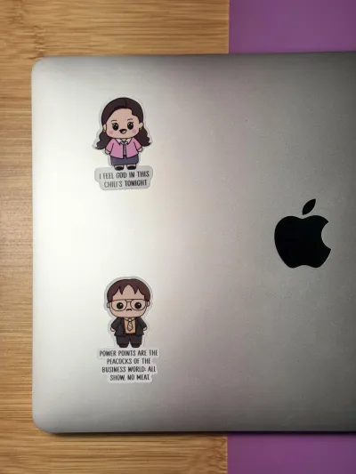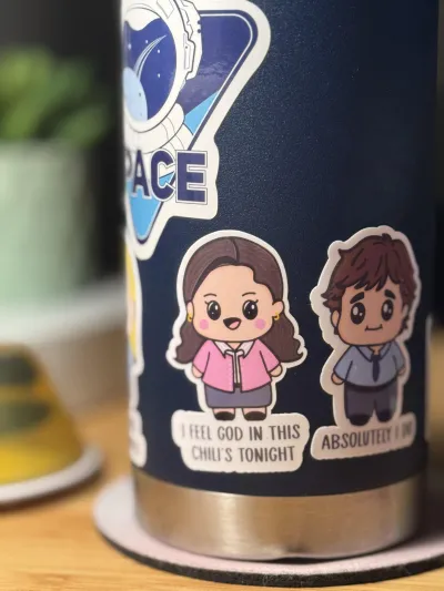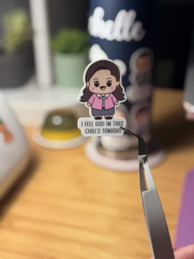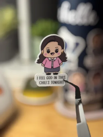 Why have Kawaii Jim without a Kawaii Pam? Kawaii Pam comes dressed in her favorite lucky pink sweater. She's feeling the buzz of that El Presidente margarita, saying one of her iconic lines, "I feel God in this Chili's tonight." 1.3" x 2" in size, Kawaii Pam is printed on premium matte, white vinyl sticker paper with a clear laminate cover, which makes it water-resistant and tear-resistant. Add more flair to your emotional support cups, jazz up your laptop, or stick her on your notebook.